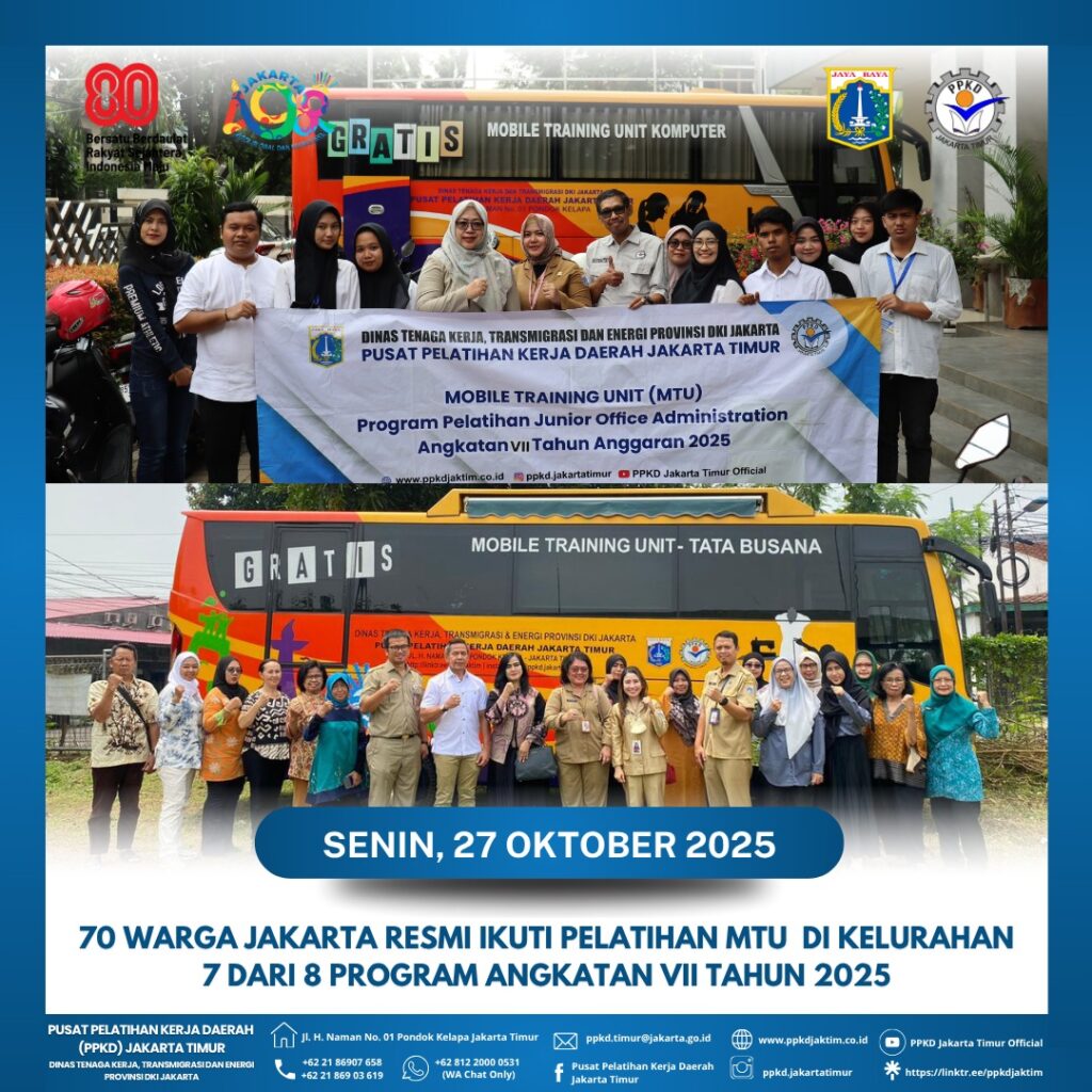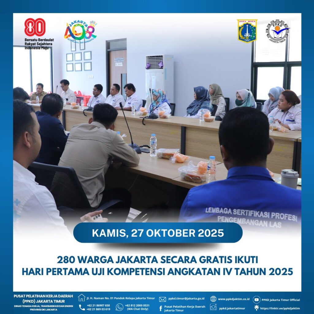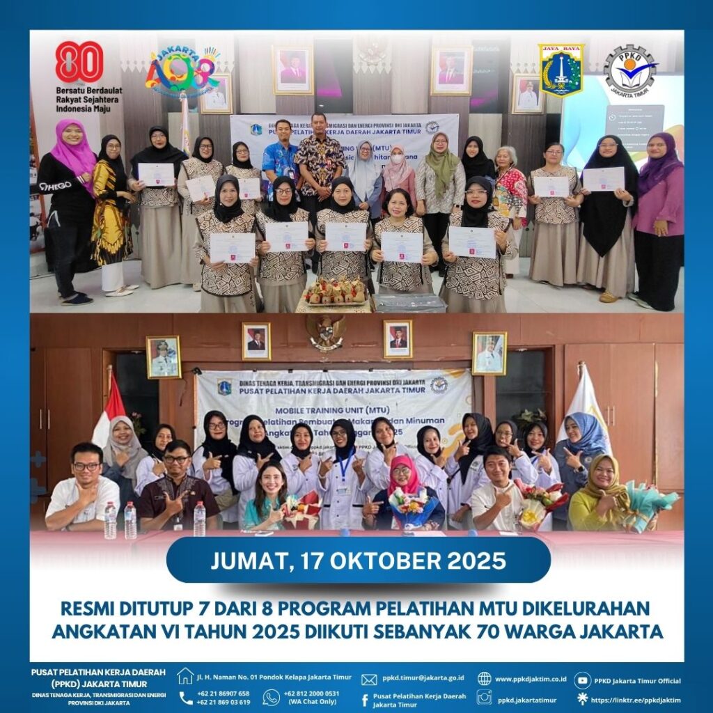 Hai! Sobat #PPKDJaktim, (30/10/2025) Resmi di tutup Kegiatan Pelatihan Keterampilan Kerja Program Reguler terdiri 17 Kelas Pelatihan sekaligus Temu Konsultasi Puluhan Perusahaan serta Sosialisasi Untuk Magang Keluar Negeri dari BP3MI Jakarta dan Sosialisasi BPJS Ketenagakerjaan bertempat di Gedung Aula PPKD Jakarta Timur. Kepala Pusat Pelatihan Kerja Daerah Jakarta Timur, H. Teguh Hendarwan, S.Sos. M.Si. turut memberikan sambutan sekaligus secara resmi menutup kegiatan pelatihan angkatan IV Tahun 2025. Sementara Testimoni perusahaan diwakilkan oleh Bapak Teguh I. S. dari Hotel The Groove by Grand Aston Bapak Teguh I. S. Turut disajikan Fashion show Performance Beauty yang merupakan persembahan peserta Program Perawatan Kecantikan, Penyerahan Cinderamata berupa Bingkisan Hampers hasil karya peserta Program Penyiapan Layanan Produk Makanan dan Minuman. Inilah wujud nyata kepedulian pemerintah provinsi DKI Jakarta dalam mengatasi masalah kemiskinan dan pengangguran melalui pelatihan kerja. #salamkompeten Link :🔸 YT : https://youtu.be/fzIegg_f6aI?si=2f8h-il5XE09Jphe🔸 Tiktok : https://www.tiktok.com/@ppkdjakartatimur/video/7566949802815245575🔸FB : https://www.facebook.com/share/v/1CwmRPKrNZ/?mibextid=wwXIfr🔸IG : https://www.instagram.com/reel/DQbdw2jjjsI/?utm_source=ig_web_copy_link&igsh=MzRlODBiNWFlZA== Blok/Pilih tulisan untuk mendengarkan