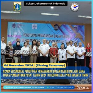 (06/11/2024) Acara Seremonial Penutupan Pemagangan Dalam Negeri melalui Dana Tugas Pembantuan Pusat Tahun 2024 diselenggarakan oleh Bidang Pelatihan dan Produktivitas Dinas Tenaga Kerja, Transmigrasi dan Energi Provinsi DKI Jakarta yang bertempat di Gedung Aula PPKD Jakarta Timur.