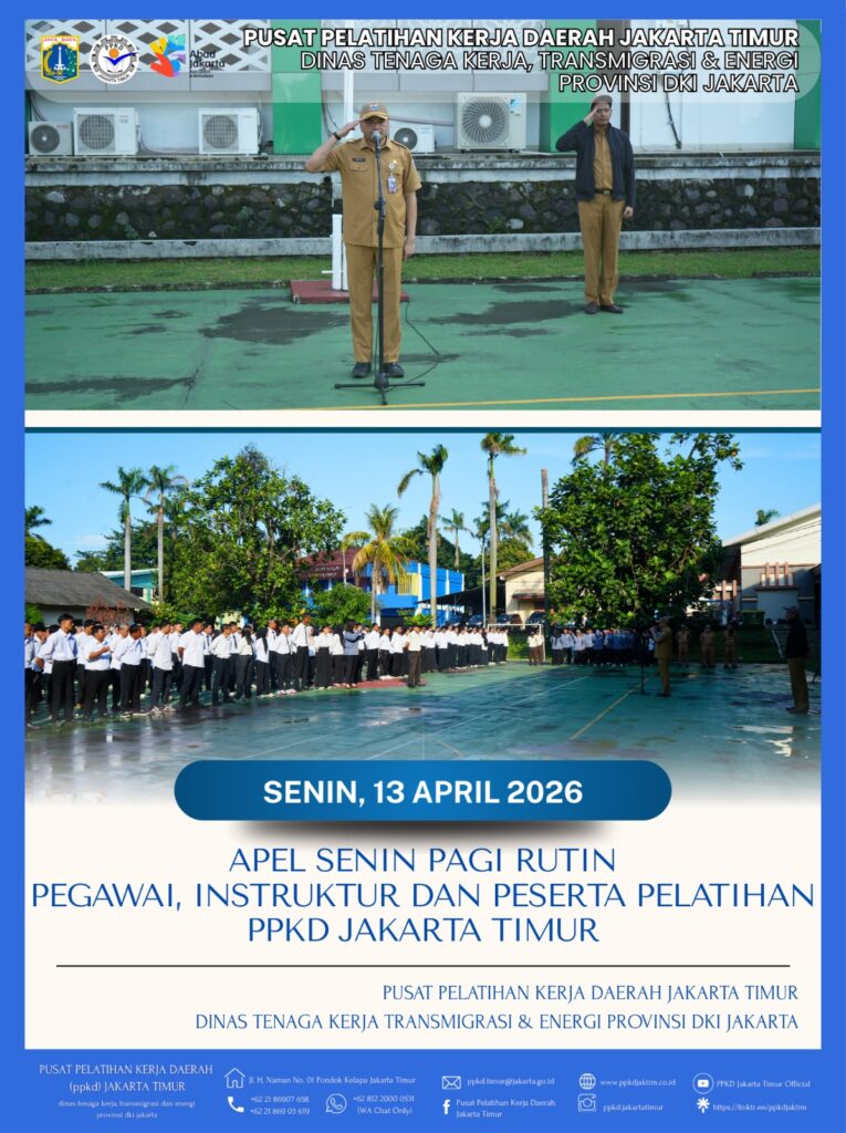 (13/04/2026) Seluruh Pegawai ASN PPKD Jakarta Timur melaksanakan Apel Pagi rutin pada setiap hari senin sesuai arahan Sekretaris Daerah Provinsi DKI Jakarta yang tertuang dalam Surat Edaran nomor 4/SE/2022 tanggal 13 Januari 2022.