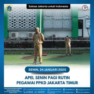 (24/02/2025) Seluruh Pegawai ASN PPKD Jakarta Timur melaksanakan Apel Pagi rutin pada setiap hari senin sesuai arahan Sekretaris Daerah Provinsi DKI Jakarta yang tertuang dalam Surat Edaran nomor 4/SE/2022 tanggal 13 Januari 2022 tentang pelaksanaan apel pagi di lingkungan Pemerintah Provinsi Daerah Khusus Ibukota Jakarta yang dipimpin oleh Kasatpel Pelatihan dan UJK PPKD Jakarta Timur, Bapak Danang Fauzan, ST,. dan diikuti pula oleh Pegawai PJLP PPKD Jakarta Timur serta Instruktur dan Peserta Pelatihan Reguler 14 Program Angkatan I Tahun APBD 2025.