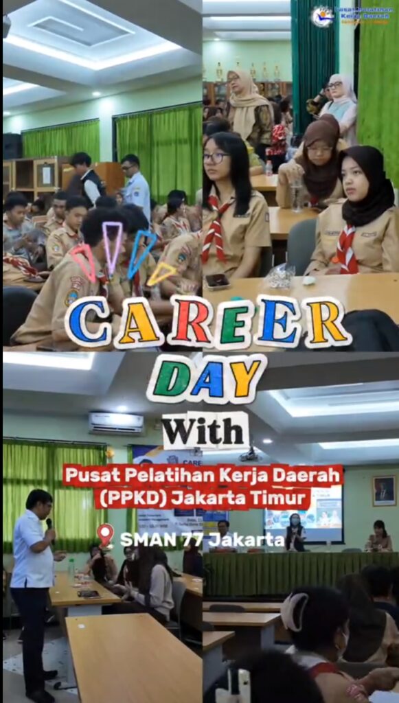 (21/01/2026) Semarakkan Career Day, Program dan kegiatan pelatihan keterampilan kerja berbasis kompetensi PPKD Jakarta Timur tahun 2026 disosialisasikan oleh Kasatlak Pengendalian dan Pemasaran beserta tim kepada Siswa/i Sekolah Kelas XI & XII SMAN 77 Jakarta.