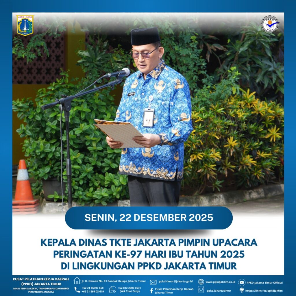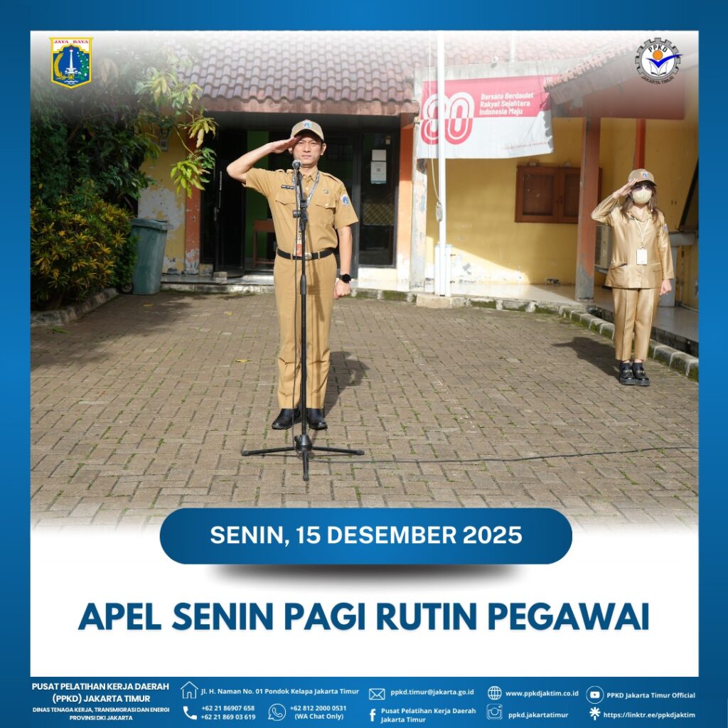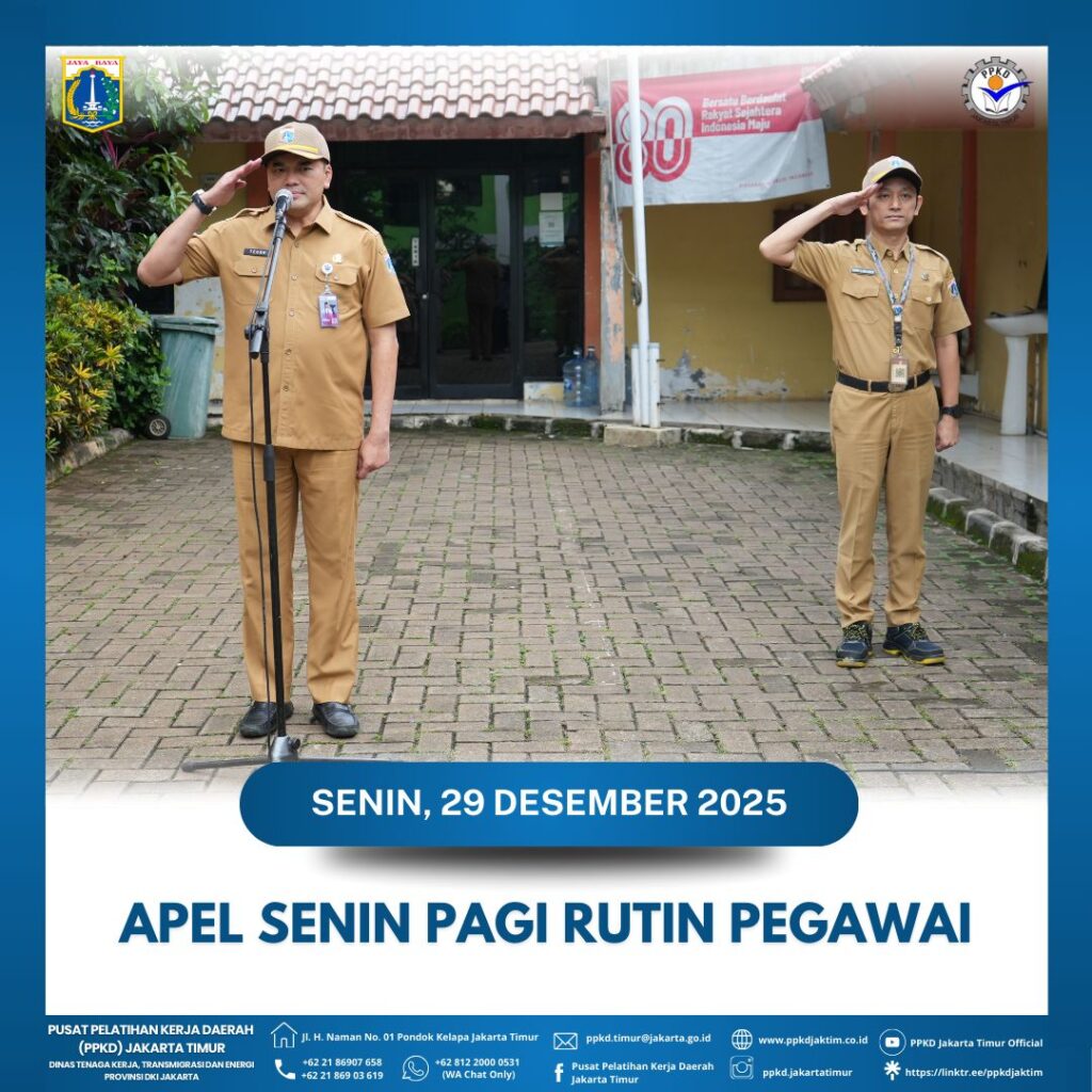 Hai! Sobat #PPKDJaktim, (29/12/2025) Seluruh Pegawai ASN PPKD Jakarta Timur melaksanakan Apel Pagi rutin pada setiap hari senin sesuai arahan Sekretaris Daerah Provinsi DKI Jakarta yang tertuang dalam Surat Edaran nomor 4/SE/2022 tanggal 13 Januari 2022 tentang pelaksanaan apel pagi di lingkungan Pemerintah Provinsi Daerah Khusus Ibukota Jakarta yang dipimpin oleh Kepala PPKD Jakarta Timur, H. Teguh Hendarwan, S.Sos., M.Si. dan diikuti pula oleh Pegawai PJLP PPKD Jakarta Timur. Link : 🔸Instagram : https://www.instagram.com/p/DS1CE-IE5Ct/?igsh=MTgwdHJkdmdiOTFkNw== 🔸Facebook : https://www.facebook.com/share/p/1B9FgxGhtT/?mibextid=wwXIfr 🔸Tiktok : https://vt.tiktok.com/ZS58PyMx6/ 🔸X : https://x.com/ppkd_jt/status/2005448443574292683?s=46 Blok/Pilih tulisan untuk mendengarkan