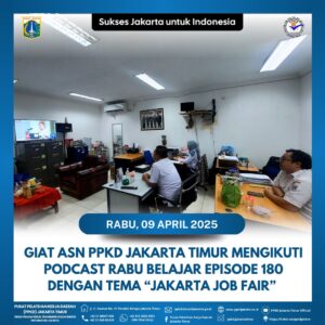 (09/04/2025) Yuk! Intip serunya kegiatan ASN Pada Pusat Pelatihan Kerja Daerah Jakarta Timur mengikuti podcast Rabu Belajar episode 180 dengan tema, “Jakarta Job Fair” bersama Kepala Dinas Tenaga Kerja, Transmigrasi dan Energi Provinsi DKI Jakarta Dr. Ir. Hari Nugroho, M.M. melalui situs simdiklat-bpsdm(.)jakarta(.)go(.)id diselenggarakan oleh BPSDM Provinsi DKI Jakarta dalam rangka menindaklanjuti Instruksi Sekretaris Daerah Provinsi DKI Jakarta No. 29 tahun 2021 tentang Pelaksanaan Kegiatan Rabu Belajar.