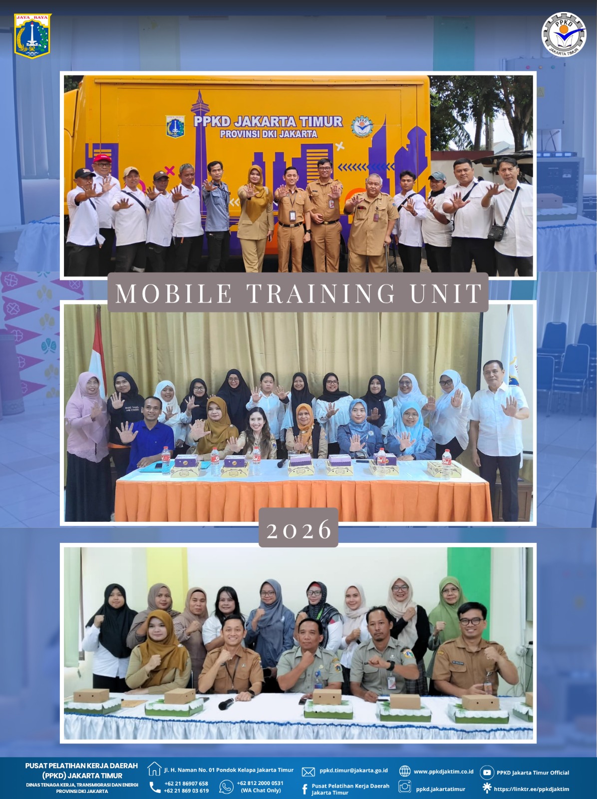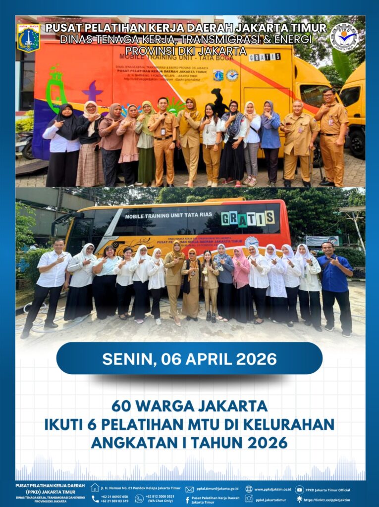 (06/04/2026) Resmi dibuka Pelatihan Mobile Training Unit (MTU) di Kelurahan Sebanyak 6 Program Angkatan I Tahun 2026 yang dijadwalkan selama 20 hari kerja (6 April s.d 4 Mei 2026) secara serentak diikuti sejumlah 60 orang warga jakarta yang tersebar di berbagai lokasi kelurahan wilayah Jakarta Timur sesuai dengan permohonan yang diajukan pemohon. Setelah selesai pelatihan, peserta akan diiikutsertakan pada Uji Kompetensi tanggal 5 Mei 2026. Sementara itu, akan menyusul dibuka secara resmi sebanyak 7 program pelatihan MTU lainnya pada hari Senin, 13 April 2026.