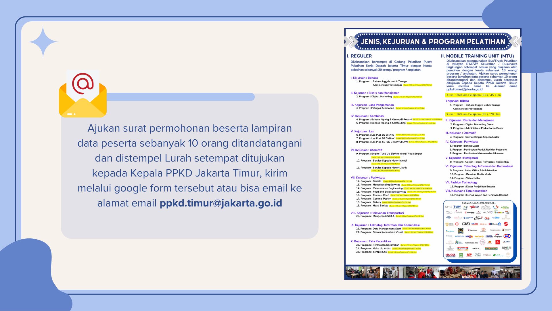 Ajukan surat permohonan beserta lampiran data peserta sebanyak 10 orang ditandatangani dan distempel Lurah setempat ditujukan kepada Kepala PPKD Jakarta Timur, kirim melalui google form atau bisa email ke alamat email ppkd.timur@jakarta.go.id