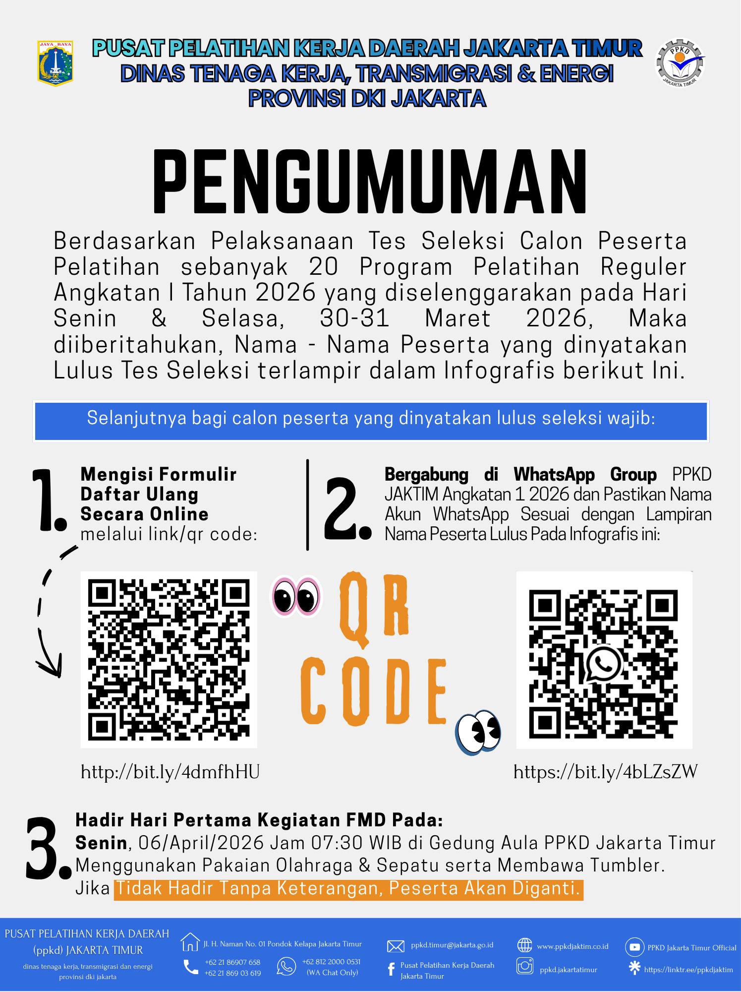 (02/04/2026) Berdasarkan pelaksanaan Tes Seleksi Calon Peserta Pelatihan yang telah dilaksanakan pada tanggal 30–31 Maret 2026, kami mengumumkan bahwa daftar nama peserta yang dinyatakan lulus seleksi telah resmi dirilis.
