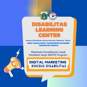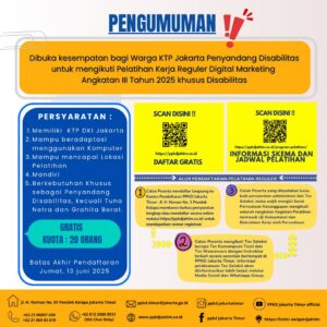(04/05/2025) Dibuka kesempatan bagi Warga KTP Jakarta Penyandang Disabilitas untuk mengikuti Pelatihan Kerja Reguler Digital Marketing