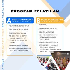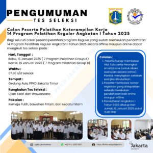 (13/01/2025) Pengumuman! Informasi bagi seluruh calon peserta pelatihan 14 program pelatihan reguler PPKD Jakarta Timur Angkatan I Tahun 2025 yang sudah melakukan pendaftaran secara offline maupun online dapat mengikuti tes seleksi pada :