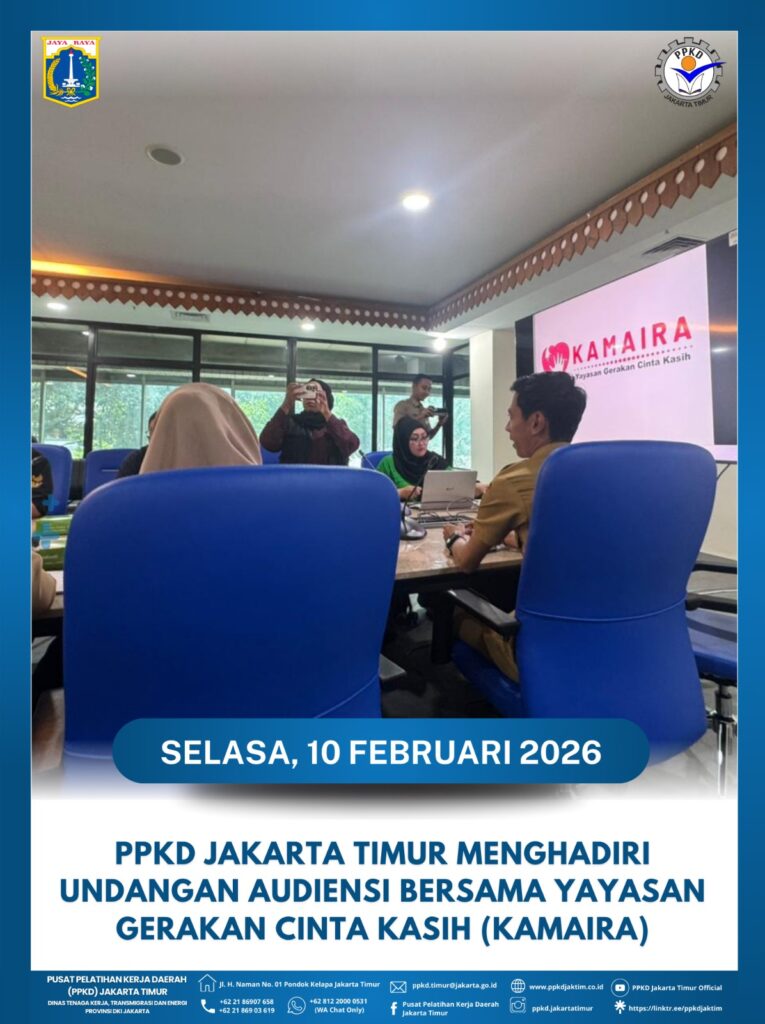 (10/02/2026) PPKD Jakarta Timur menghadiri undangan audiensi bersama Yayasan Gerakan Cinta Kasih (KAMAIRA) yang dipimpin oleh Sekretaris Kota (Sekko) Administrasi Jakarta Timur, Eka Darmawan, bertempat di Ruang Rapat Blok A Lantai 2, Gedung Walikota Administrasi Jakarta Timur.