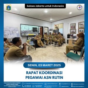 (03/03/2025) Seluruh pegawai ASN PPKD Jakarta Timur melaksanakan Rapat Koordinasi rutin pegawai dipimpin oleh Kepala Pusat Pelatihan Kerja Daerah Jakarta Timur, Bapak H. Teguh Hendarwan, S.Sos. M.Si.