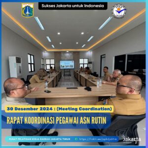 (30/12/2024) Seluruh pegawai ASN PPKD Jakarta Timur melaksanakan Rapat Koordinasi rutin pegawai dipimpin oleh Kepala Pusat Pelatihan Kerja Daerah Jakarta Timur, Bapak H. Teguh Hendarwan, S.Sos. M.Si.