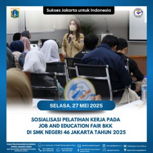 (27/05/2025) Sosialisasi Program Pelatihan Kerja berbasis kompetensi pada Pusat Pelatihan Kerja Daerah (PPKD) Jakarta Timur oleh Kepala Satuan Pelaksana Pengendalian & Pemasaran, Linda Apriyantini,S.Sos di acara Job and Education Fair BKK Tahun 2025 yang diselenggarakan oleh Sekolah Menengah Kejuruan Negeri 46 Jakarta dalam rangka penyebarluasan informasi Program dan kegiatan Pelatihan Keahlian dan Keterampilan Kerja pada Pusat Pelatihan Kerja Daerah Jakarta Timur serta penyampaian materi terkait persiapan memasuki dunia kerja / industri.