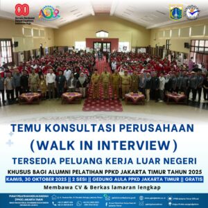 (28/10/2025) Yuk, Hadiri Acara Temu Konsultasi Perusahaan (Walk in Interview) Khusus bagi alumni Pusat Pelatihan Kerja Daerah (PPKD) Jakarta Timur Tahun 2025. Tersedia juga Peluang Kerja Luar Negeri ‼️