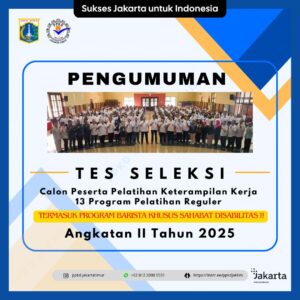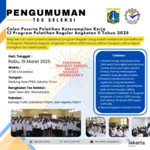 (17/03/2025) Pengumuman! Informasi bagi seluruh calon peserta pelatihan 13 program pelatihan reguler Angkatan II Tahun 2025 termasuk kelas Barista Khusus Bagi Sahabat Disabilitas PPKD Jakarta Timur Tahun 2025 yang sudah melakukan pendaftaran secara offline maupun online dapat mengikuti tes seleksi pada :