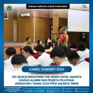 (13/03/2025) PPKD Jakarta Timur menggelar Tes Seleksi Rekrutmen/ OJT (On Job Training) pada The Orient Jakarta Hotel khusus bagi peserta Pelatihan Angkatan I Tahun 2025 PPKD Jakarta Timur pada hari Rabu, 12 Maret 2024 bertempat di Gedung Aula PPKD Jakarta Timur.