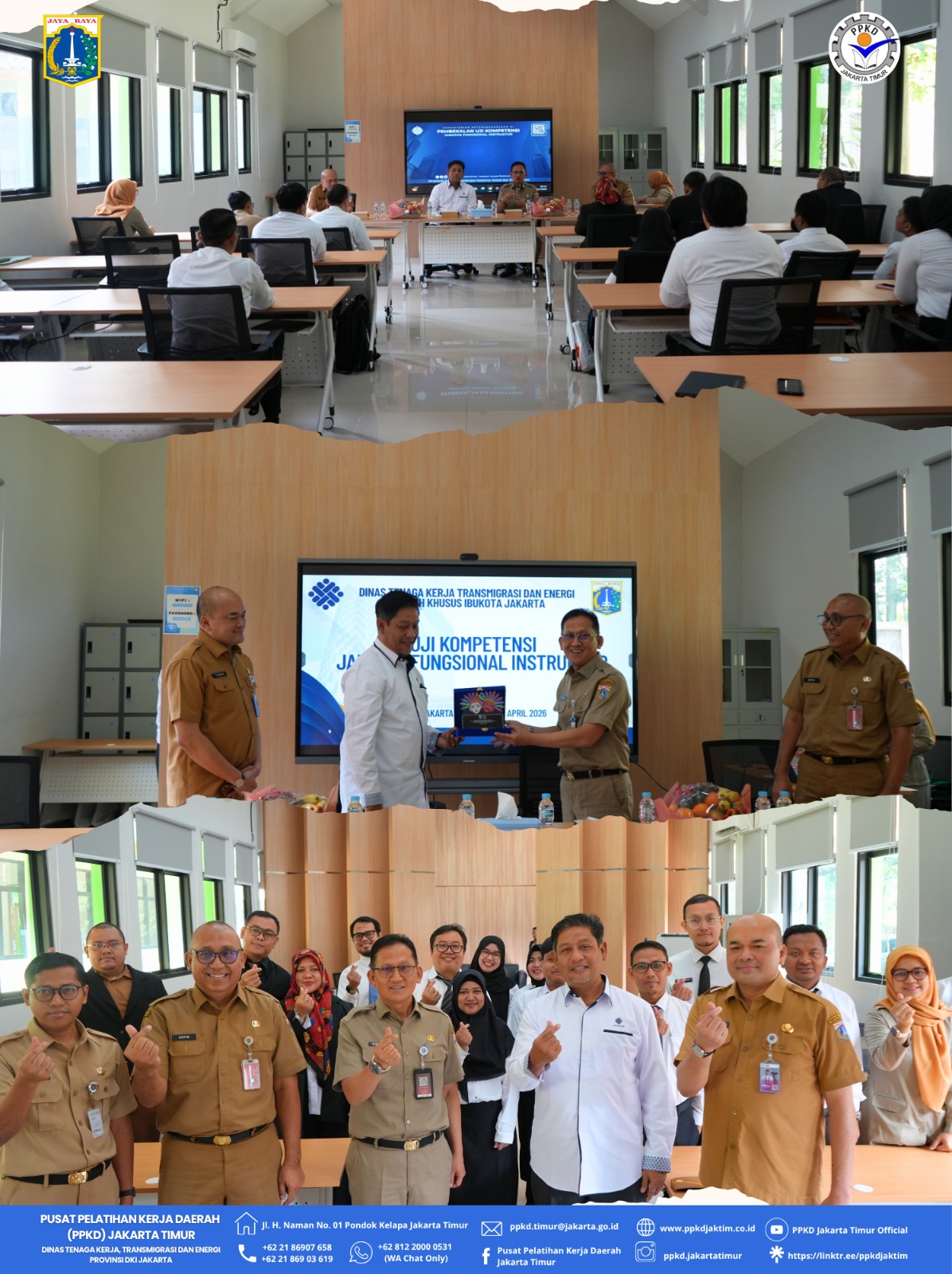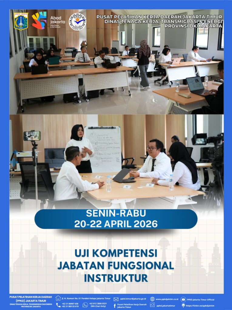 (24/04/2026) PPKD Jakarta Timur sukses memfasilitasi Pelaksanaan Uji Kompetensi Jabatan Fungsional Instruktur pada Instansi Pengguna yang berlangsung selama 3 hari mulai hari senin s.d rabu, tanggal 20 s.d 22 April 2026 bertempat di Gedung Pelatihan Disabilitas PPKD Jakarta Timur diikuti oleh 10 orang Instruktur di lingkungan Dinas Tenaga Kerja, Transmigrasi dan Energi Provinsi DKI Jakarta termasuk pegawai PPKD Jakarta Timur.