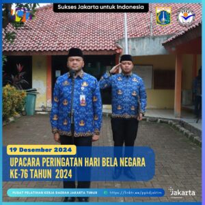 (19/12/2024) Seluruh pegawai ASN PPKD Jakarta Timur melaksanakan Upacara Peringatan Hari Bela Negara ke-76 Tahun 2024 sesuai Surat Edaran Badan Kepegawaian Daerah Provinsi DKI Jakarta Nomor e-0040/SE/2024 tanggal 18 Desember 2024 tentang Upacara Peringatan Hari Bela Negara ke-76 Tahun 2024 di Lingkungan Pemerintah Provinsi DKI Jakarta dan diikuti pula oleh Pegawai PJLP PPKD Jakarta Timur.